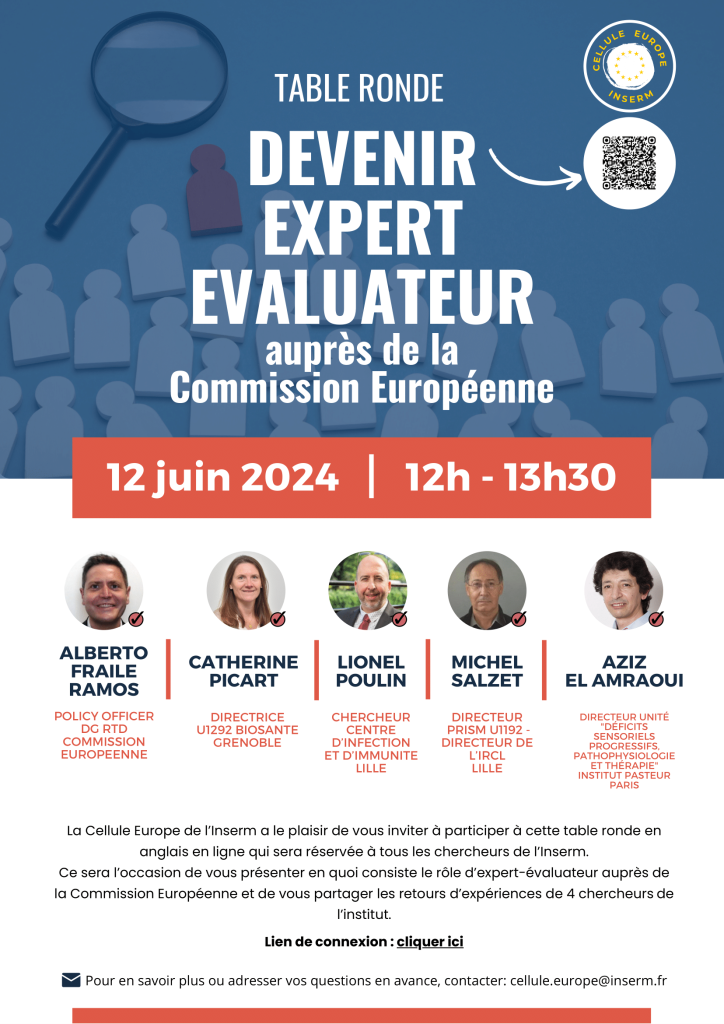 Devenez expert évaluateur Date Devenez expert évaluateur Le 12 juin 2024, la Cellule Europe de l’INSERM organise une table ronde en anglais, en ligne, pour présenter le rôle de d’expert-évaluateur auprès de la Commission Européenne. Autres articles
