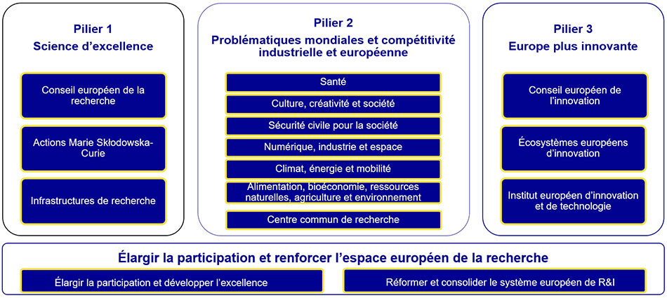 Horizon Europe est constitué de trois piliers, et d’un socle transversal destiné à renforcer l’Espace européen de la recherche.